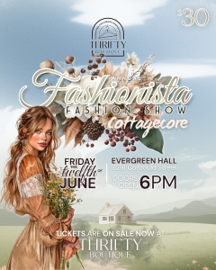 Join us for the 8th annual Thrifty Boutique Fashionista Fashion Show, supporting Chilliwack Hospice Society, on Friday, June 12 at Evergreen Hall. This year’s cottagecore theme will bring a whimsical evening of vintage charm, soft florals and countryside-inspired style to the runway.